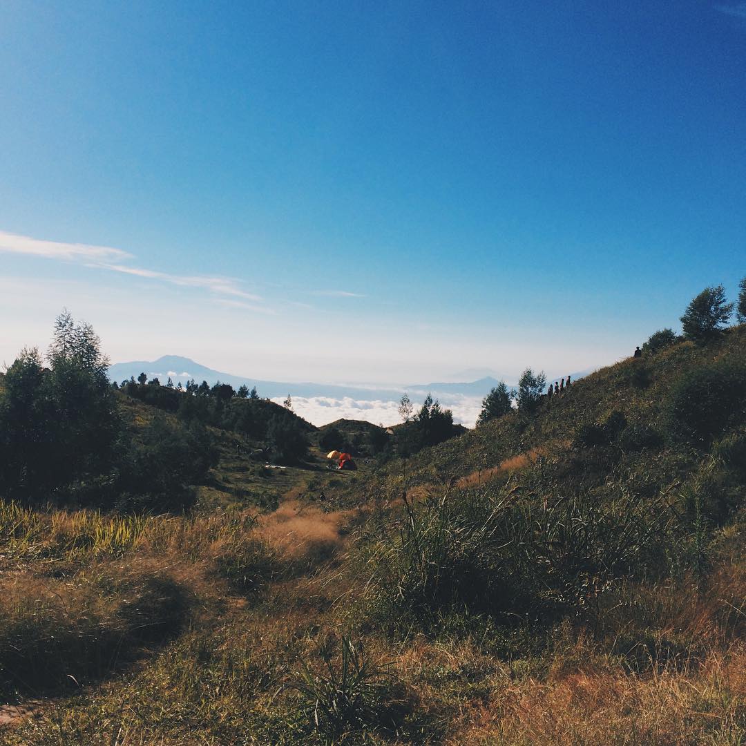Perjalanan menuju Puncak Prau tidak terlalu jauh namun menanjak. Hati-hati melewati jalur ini karena medannya berbatu dan terdapat jurang yang cukup dalam di kiri-kanan jalur. Dalam waktu 45 menit Anda akan sampai di area camping, tepatnya di kawasan Bukit Teletubbies. Area yang cukup luas, datar, dan aman untuk camping.