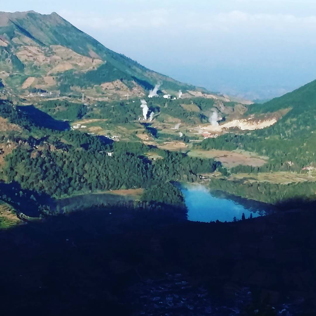 Dari puncak Gunung Prau Dieng Anda bisa melihat lanskap pemandangan alam Dataran Tinggi Dieng dari atas. Keindahan telaga-telaga Dieng di kelilingi bukit dan gunung tinggi berselimut kabut sangat menyejukkan mata. Jika cuaca tidak berkabut Anda bisa melihat view gunung-gunung di Pulau Jawa di kejauhan, seperti Gunung Merapi, Gunung Sindoro, Gunung Sumbing, dll. Selain itu lahan-lahan pertanian yang terhampar di lereng-lereng gunung serta rumah-rumah penduduk ditutupi kabut tipis pegunungan melengkapi keindahan Dataran Tinggi Dieng.